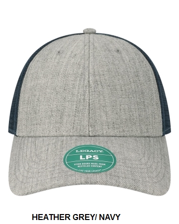 LEGACY LPS. Item #: 93895 65/35 cotton/polyester. Heather Grey is 10/55/35 wool/acrylic/polyester. Mesh back. Structured, six-panel, low-profile. Pre-curved visor, visor board transitioning to recycled content. Snapback closure.