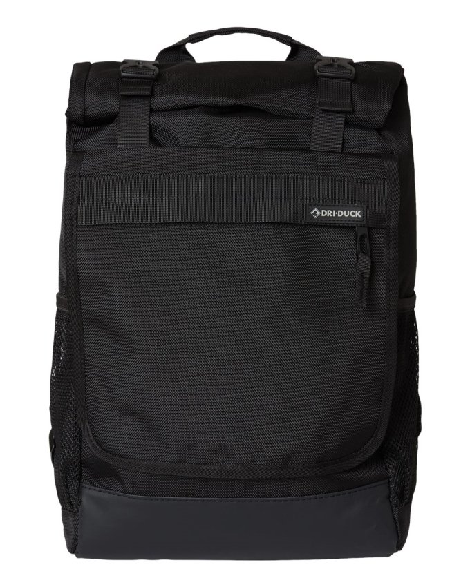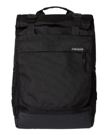 DRI DUCK 1410DD. Style #: 1410DR 1680D, 100% ballistic nylon bonded to a waterproof membrane, 12.6L. Padded laptop compartment fits up to 17" laptop. Interior pocket with key clip and zipper closure. Two interior slip pockets. Roll top closure with adjustable straps and slide release plastic fasteners. Sturdy top grab handle. Large exterior flap pocket with hook and loop closure. Exterior pocket on flap with zipper closure. Side-entry security pocket with zipper closure at wearer's back left. Secure mesh water bottle pockets. Adjustable padded straps. Comfort mesh padded back. Sturdy padded bottom.