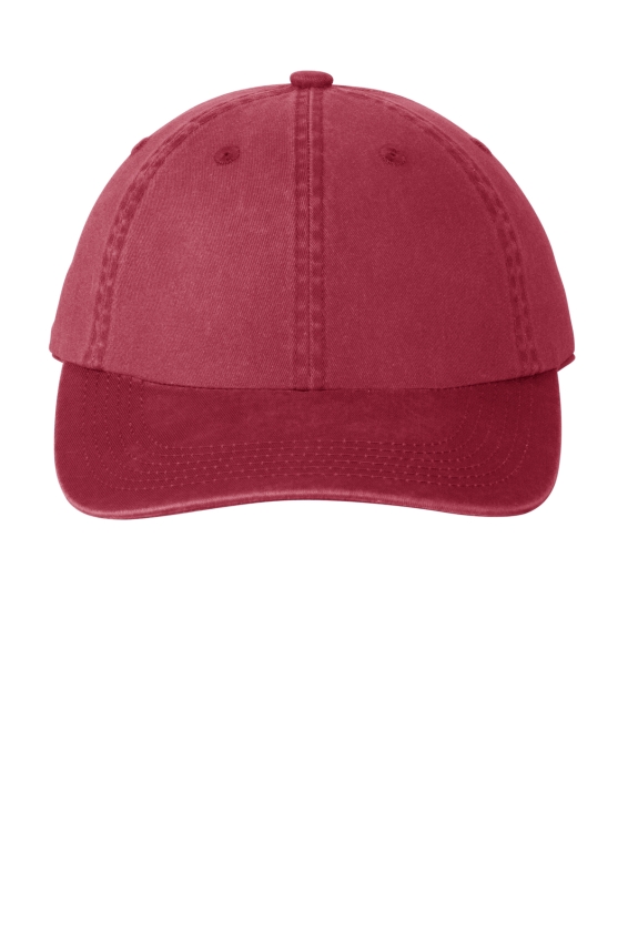 PORT A. PWU. Our popular pigment-dyed. garment washed* cap has a lived-in look and is slightly brushed for softness and comfort. Fabric: 100% garment washed cotton twill. Structure: Unstructured. Profile: Low. Closure: Self-fabric slide closure with buckle and grommet.