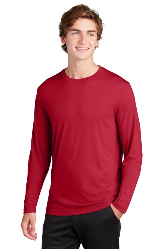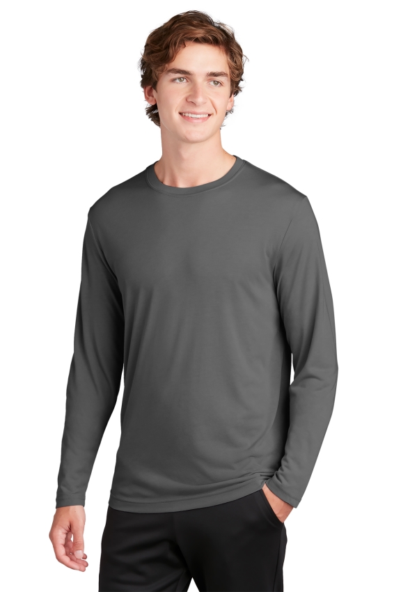 SPORT-TEK ST450LS. A soft cotton hand merges with color-locking, moisture-wicking performance in this tee that also has a matte finish.4.7-ounce, 100% spun polyester jersey with PosiCharge technology. Soft cotton hand. Removable tag for comfort and relabeling. Dyed-to-match neck taping. Set-in sleeves.