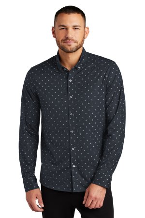MERCER+M MM1018 All the traditional components of a classic dress shirt combined with the comfortable drape of soft jersey fabric in a modern moisture-wicking hybrid silhouette. A versatile choice for the office featuring all the comfort of a favorite tee. Fabric+Weight. 5-ounce. 92/8 poly/spandex jersey.