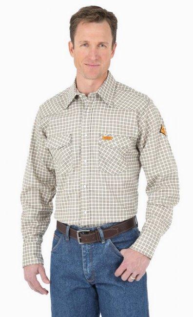 6.5oz 88%Cotton/12% Nylon 2 pocket with snaps Wrangler FR is made to self-extinguish proetecting you from burn injury on the job. And, with fits built for comfort and durability, you can work safer in the style you get only from Wrangler. NFPA® 2112 Compliant CAT 2. Meets ASTM 1506, NFPA -70E HRC2 APTV 9.5 cal