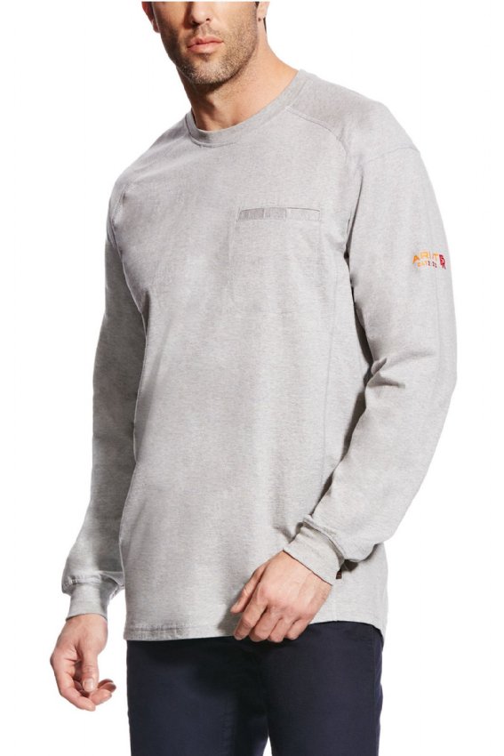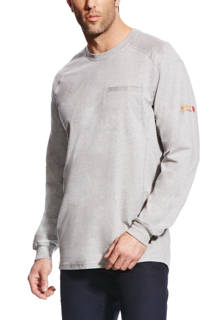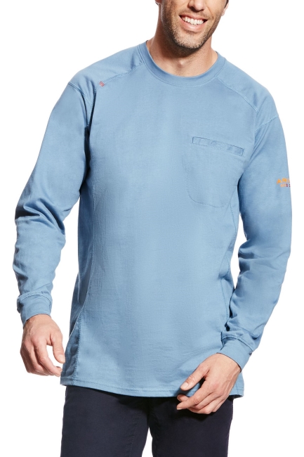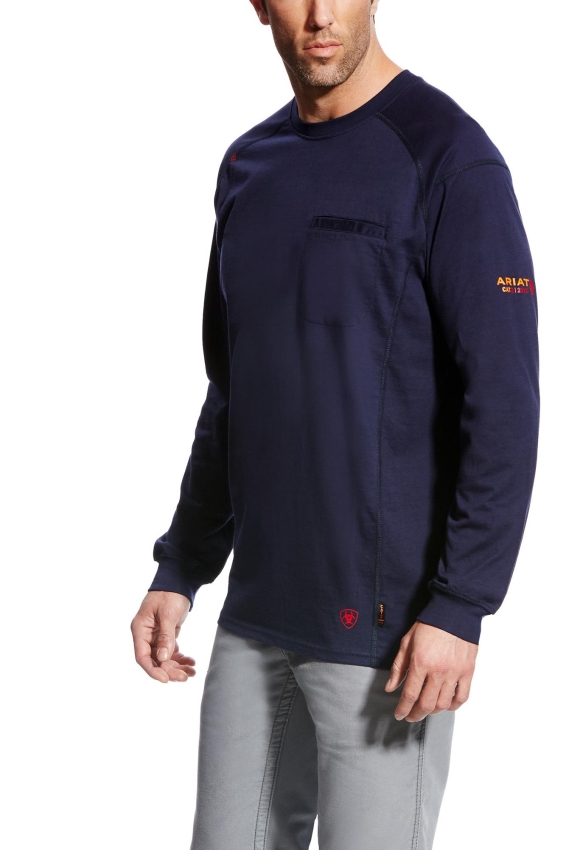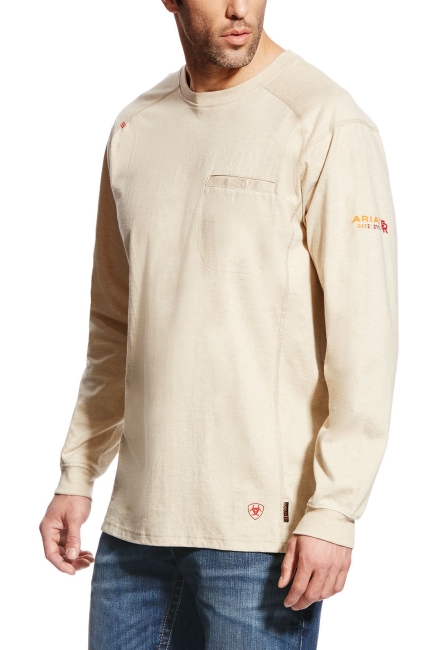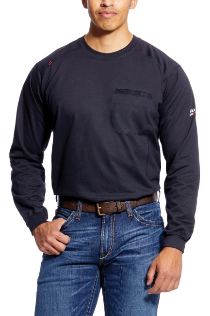 Ariat Long Sleeve T. Flame resistant knit shirts are constructed with the ultimate comfort, technology and durability in mind. Our FR Air Crew features lightweight 6 oz jersey fabric and a convenient Velcro closure chest pocket .• CAT 2 • ATPV 8.7 cal/cm2 • NFPA 70E • NFPA 2112 • Lightweight 6 oz FR jersey • Greater Arm Mobility seam construction for maximum range of motion • Ribbed collar and cuffs • Chest pocket with Velcro® closure • 100% cotton