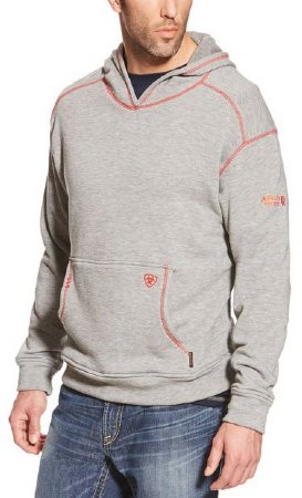 Ariat 10 oz FR knit. 44% viscose, 39% modacrylic, 14% para aramid, 3% spandex. Water resistant finish. Jersey/ Velour Dual Hazard technical midlayer insulation. Attached hood. Front handwarmer pouch pocket. Contrast coverstitch. HRC 2, ATPV 16 cal/cm^2 . NFPA 2112 & 70E