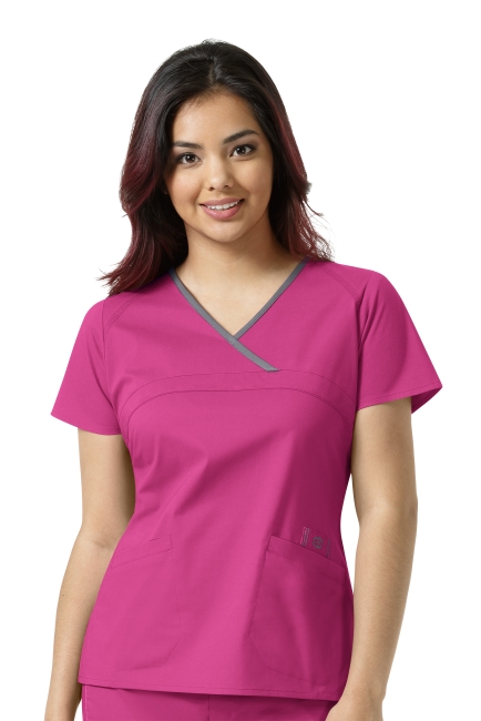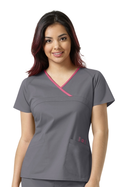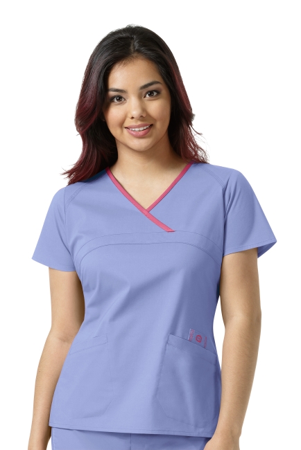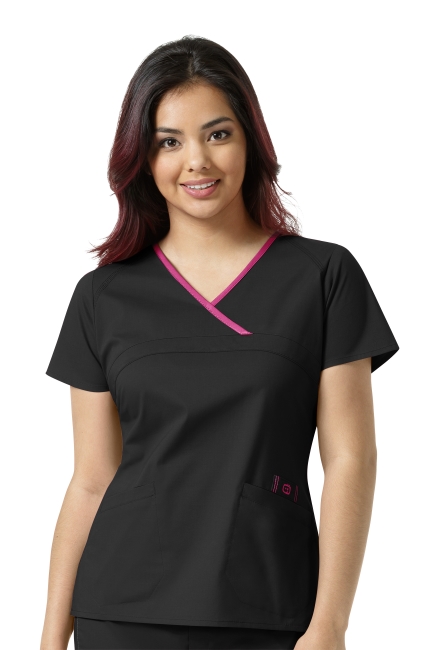 WONDER WINK WW6808 Ladies WonderWink Fit. Cross-over contrast neck-line with covered band. 2 lowers welt pockets. Triple needle stitching throughout. Logo LE badge. Side vents. 52% Cotton / 45% Polyester / 3% Spandex.